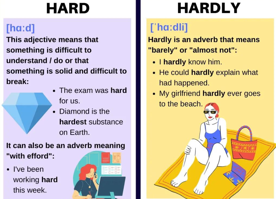 You use hardly in expressions such as hardly ever, hardly any, and hardly anyone to mean almost never, almost none, or almost no one.